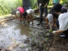 汚れてもいい服装に着替えて、いざ田植え開始。泥の感触に驚きながらも、楽しんで行っていました。