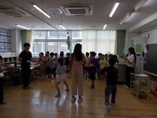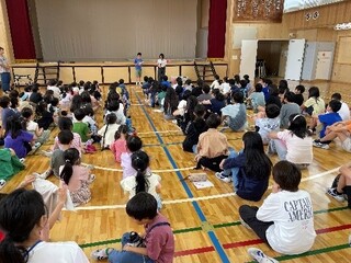 30日に全校で留学生交流会を行いました。約40人の留学生が赤松小を訪れ、体育館で英語の歌を一緒に歌ったり踊ったりしました。