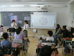 全校での会の後は、各教室に2~3人ずつ留学生がやってきて、交流しました。