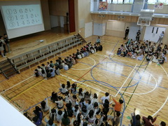 今日、全学年が体育館に集まり、一年生を迎える会が行われました。在校生と一年生が初めて顔合わせをしました。一年生が入場するとき、六年生が手をつなぎ、一年生一人一人を呼名してくれました。