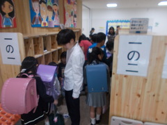 ピカピカのランドセルを背負ってやってきた1年生を、6年生が教室まで案内しました。