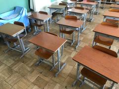 教室の机は、距離を離しています。(この写真からさらに一席あけて座ります)