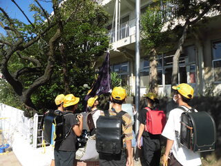 その1つが「旗当番」です。全校児童が登校する前、下校した後に校旗と安全旗を6年生が揚げたり、下げたりしています。毎日欠かさずに、6年生全員が取り組んでいます。お互いに教え合い、引き継ぎながら池雪の伝統を守っています。