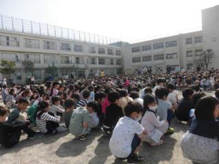 校庭に初めて全校児童が集まり、1年生を迎える会を行いました。