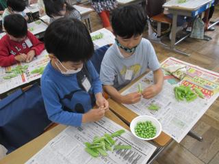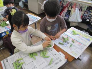 グリンピースをむきながら「ものによって、入っている豆の数が違うね。」「さやを開くときに、ポンって音がするよ。」とたくさんのことに気付いたようでした。
