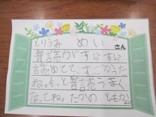 「すらすら読めててすごいね!」「びっくりするくらい上手でした!」などと、たくさん褒めてもらい、自信につながったようでした。
