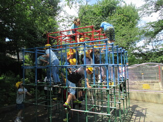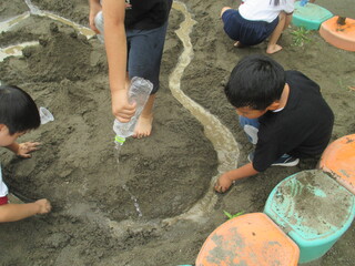水をたくさん使って川や足湯を作るチームもあり、それぞれがイメージを広げながらみんなで楽しむことができました。