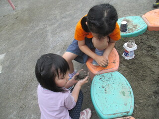土に水を含ませて、どんな触り心地なのか、どんな音がするのかを試してみたり、団子やお城などの形を作って楽しんだりしました。