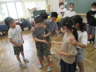じゃんけん列車や爆弾ゲーム、猛獣狩りなど、班長の6年生が中心になり、みんなが楽しめるゲームを企画してくれました。