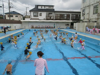 どきどきの水泳指導が始まりました。1年生は水に慣れるための水遊びが中心です。