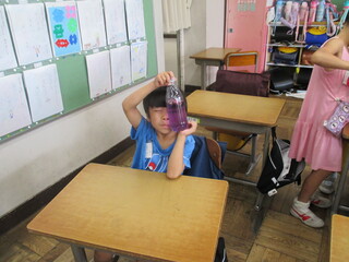 咲き終わった花と水をペットボトルに入れて振ると色水ができました。