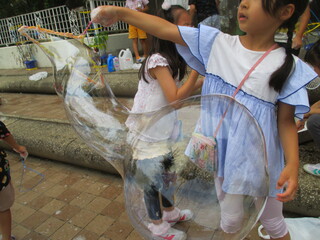 ハンガーでのシャボン玉づくりは難しく、苦戦している子が多かったですが、「ハンガーを平らにするといいよ!」「ゆっくり動かすと大きなシャボン玉になるよ。」と、発見したことを共有しながら遊ぶことができました。