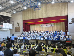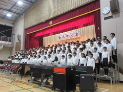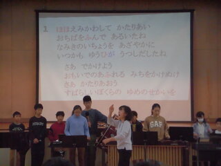 みんなで歌ったのは、音楽会の全校合唱曲「夢の世界を」です。