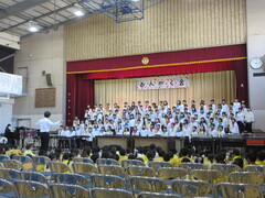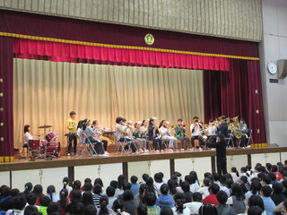 金管バンドクラブが大田区の合同演奏会に参加することになり、本番前に全校の前で演奏してくれました。