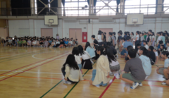 音楽朝会では、他学年を意識できるよう「ドレミの歌」で人間けんばんを楽しみました。学年ごとに割り当てられた階名のところで立って歌います。ドキドキしながらも割り当てられた階名のところで立って歌い、みんなで盛り上がりました。他学年の歌声も聴けてよかったです。先生チームもがんばりました。最後は、楽しい気持ちのまま今月のうた「となりのトトロ」を歌い、体育館中に明るい歌声が広がりました。