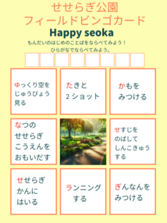 フィールドビンゴカードに書かれているお題をクリアしてビンゴをすると、せせらぎ公園カードを景品として渡すという企画です。