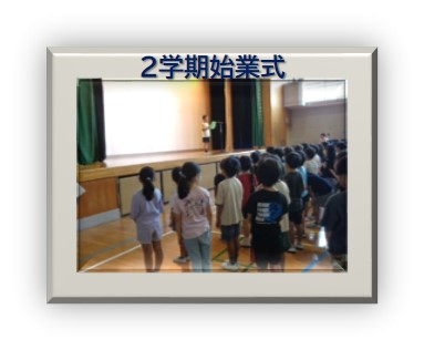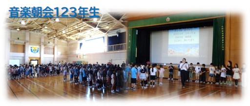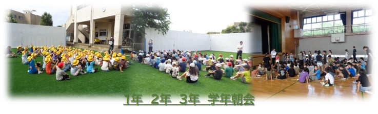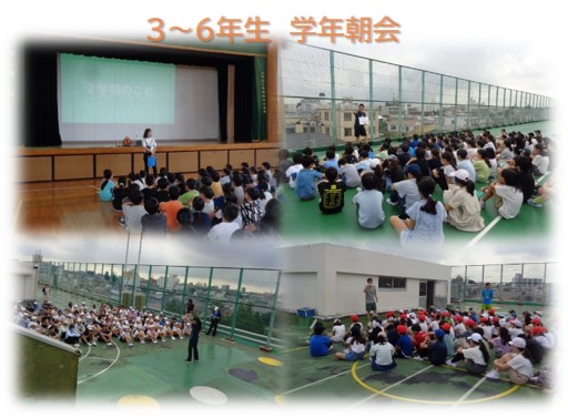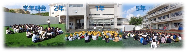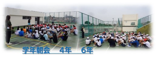 人工芝の校庭には1年生と2年生、東校舎前の校庭には5年生が集合し、本年度最初の学年朝会をもちました。