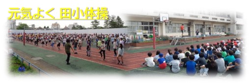 令和4、5年度の体育科の校内研究で開発された「田小体操」(=体育等の授業の準備運動)を体育朝会で復習しました。
