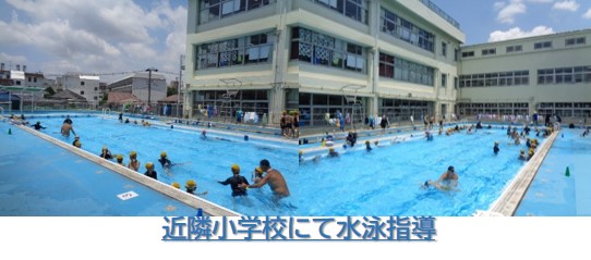 校舎改築工事のため、近隣の小学校のプールに出向いて水泳の授業をしています。