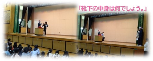 学年1名が代表で、壇の上の大きな靴下の中に入っている物を予想し、こどもたちみんなで選択肢から回答するものでした。
