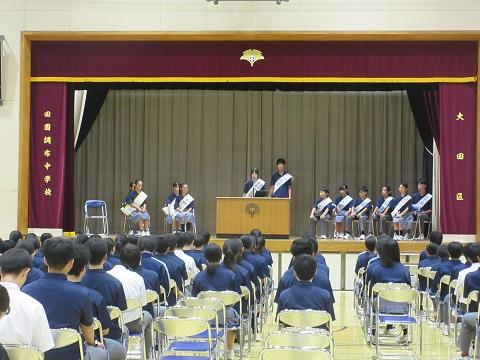 生徒会本部役員を決める立会演説会が行われました。立候補者と応援演説者があついメッセージを演説し、選挙が行われ、新たな本部役員が決まりました。旧役員メンバーからバトンタッチし、さっそく新体制でスタートしました。旧役員の活躍を引き継ぎ、田園調布中学校生徒会がますます活気ある活動ができるよう期待します。