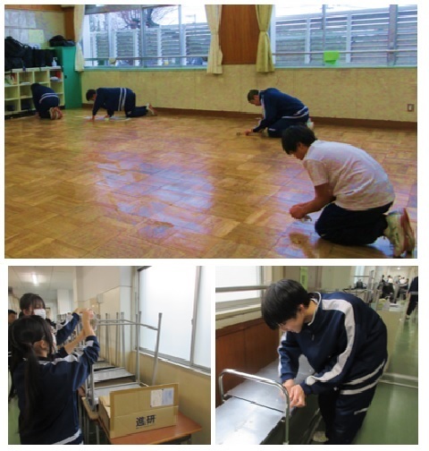 学期末に、いつも大掃除をします。美化委員が中心となり、2学期間使用した校舎を感謝の気持ちできれいにしました。机・椅子の脚を拭いたり、ロッカーや棚を拭いて整理整頓をしたりしました。その後、美化委員がワックスがけを行いました。