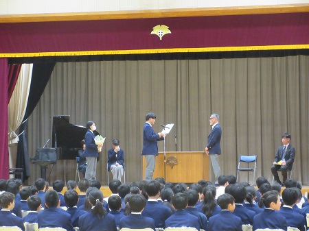 生徒会朝礼が行われ、「新年の抱負」についての発表がありました。「新年の抱負」は、昨年一年間を振り返り、新年に向けての目標や決意を新たにし、また、各学年の新年の抱負を聴くことにより、自分自身の新年の抱負への思いを深めることを目的とし、毎年、全員が冬休みの課題として書きます。提出後、各学年代表者1名を決め、この朝礼で発表しました。みな、真剣に耳を傾け、それぞれの新年の抱負を聴き入っていました。
