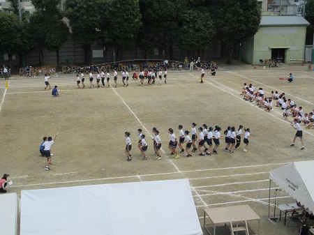 1年生の学年種目は「台風の目」、2年生は「二人三脚」、3年生は「むかで競争」。みんなで協力しながら、真剣に挑んでいました。今年度は、各学年選抜の縦割り競技「野を超え、山越え」「だるま運び」や、生徒会種目「大繩とび」が行われ、声を掛け合い、クラスの絆を深めながら、一生懸命取り組んでいました。