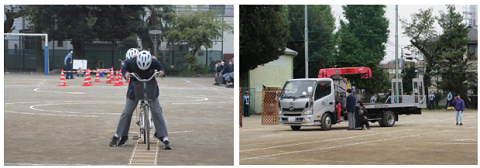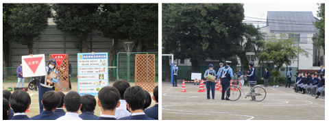 3年に一度開催される「スケアード・ストレイト」(自転車安全教室)が、田園調布警察署、大田区都市基盤整備部、スタント会社の皆様のご協力により行われました。警察による交通安全教室、自転車実技教室、スタントマンによる交通事故再現が行われ、自転車を安全に乗るために重要なこと、そしてどんな運転が事故につながるかを学習しました。