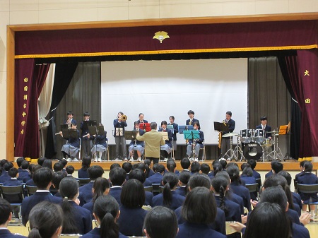 対面式が行われました。吹奏楽部の演奏で始まり、学校紹介・専門委員会紹介・部活動紹介・校歌紹介が行われました。