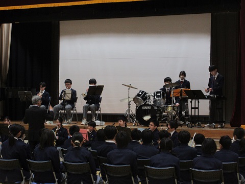 対面式が行われました。吹奏楽部の演奏で始まり、年間行事、委員会、部活動の紹介があり、新入生はとても真剣に聴いていました。