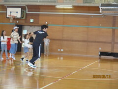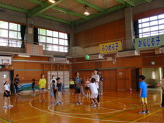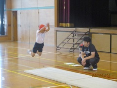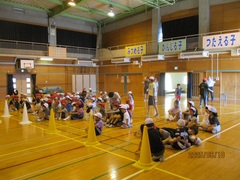 体育館で雨天バージョンの4種目を全学年実施しました。ソフトボール投げは、明日、ラインを引き直して実施する予定です。