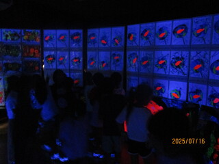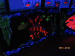 それをブラックライトに照らして鑑賞する学習を視聴覚室で行いました。