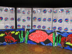視聴覚室を真っ暗にし、その中に2年生の作品『たくさん うつそう 私の形 ~スイミーの仲間たち~』