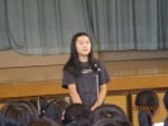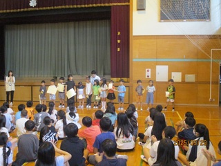 児童代表の言葉では、5年1組の西村美春さんが、1学期を自己評価して2学期に頑張りたい学習内容について、原稿を持たずに暗唱しました。さすが高学年という発表に大きな拍手が送られました。