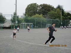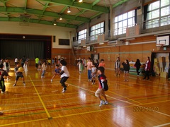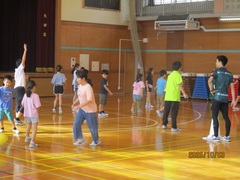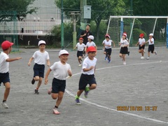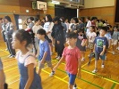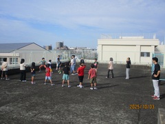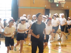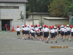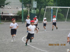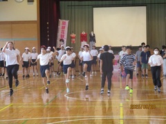 1回目の練習は、ウォーミングアップ(Jog、動的、流し)、20分Jog、クールダウンを行いました。初めての練習だったので、ウォーミングアップから「きつい!」の声が上がっていました。本日のメイン練習は20分Jogで、体育館の後ろもコースとして設定し、1周約240mのコースを各自のペースで、襷をつけながら走りました。途中少し歩いてしまう児童もいましたが、参加した児童+教員4名は、全員完走することができました。今日はとてもきつそうでしたが、1か月半後には20分Jogが楽に走れる持久力がついていることと思います。