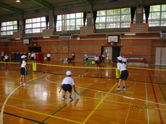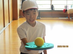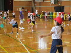 3,4年生は、本日教えてもらったテニピンを、手作り段ボールラケットやテニス協会から借りたラケットを使用して、