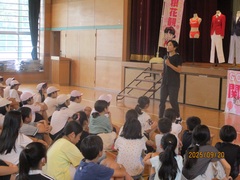 1,2年生は、「自分の身は自分で守る」という危険回避の心構えを、「いかのおすし」というキーワードを