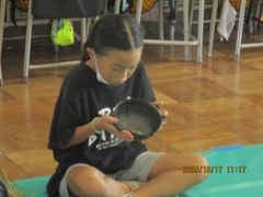 4年生は、エスカルゴの皆さんのご指導の下、点字器と点筆を使って点字を書き、凹凸から文字を読み取る体験をさせていただきました。こどもたちは、体験なので興味をもって取り組んでいましたが、視覚に障がいのある方々は、これを日常の文字・会話として使用していると考えたら、「大変なことだ」という感想をあげていました。