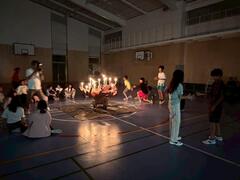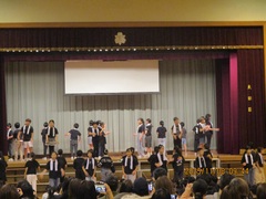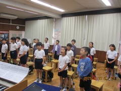 本日、音楽朝会の時間に、周年集会で全校合唱する『はじまりの歌』の練習が体育館で行われました。体育館の中は、壁に紅白幕が付けられ、いよいよ本番間近という様子になってきました。