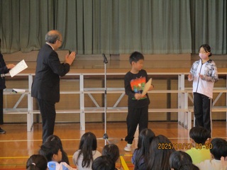 また、校歌斉唱では、ピアノ伴奏を6年2組の出川彩千南さんが行いました。素晴らしい伴奏に大きな拍手が送られました。