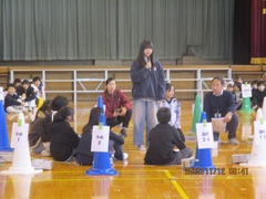 体育館の真ん中で集会委員が問題を出します