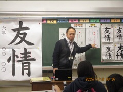 本日1校時に6年1組の書写の授業では、筆順と点画のつながりを意識して書くをめあてに取り組んでいました。まずは手本を見ずに、硬筆と毛筆で『友情』を書きました。そこから、意識すべき原理と原則について考えました。「りっしんべんの形」「間隔」などに気付き、ペアで助言し合いながら、スキルを高めていきました。