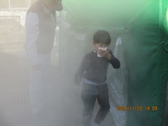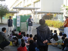 集合して校長先生からのお話を聞いた後、今日は大田区の防災課の方にお越しいただき、煙体験を実施しました。火事で煙が出ているときの避難の仕方を、教えていただき、その後は、1,3,5年生が煙体験ハウスの中を実際に入って出ていく体験をしました。煙体験ハウスの煙は無害なものですが、やはり煙がたかれている中は「前が見えない」「呼吸がしにくい」などを感じながら、口にハンカチを当て、低い姿勢で歩くことを教えていただき、実際にやってみました。こういう体験が、いざという時に必ず役に立ちます。来年度は、今の2,4年生と、新1年生が体験する予定です。
