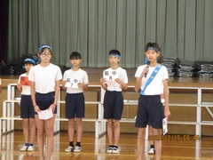 今日は、駅伝大会の表彰が全校朝会で行われ、がんばった16人の選手に大きな拍手が送られました。