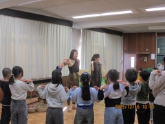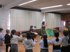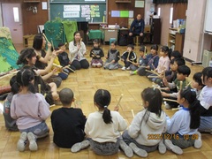 不思議な言葉で、こどもたちに音を伝え、触ったり、鳴らしたり、聴いたりしながら、体全体で音の世界を感じさせていました。日本語で指示することは一切なく、お二人のジェスチャーや音によってこどもたちはどんどん音の世界に引き込まれていきます。音楽室が異次元空間に変わっていきました。こどもたちも最後は同じように不思議な言葉を発していました。今回の題目は『GO ワイルド!』でした。
