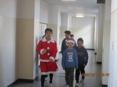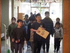 毎回楽しい企画の児童集会、今回は『サンタさんからの挑戦状』です。1年生から6年生までが1,2人ずつ集まって異学年チームを作り、暗号を解きながらクリスマスカードを完成させていきます。体育館から出発して、10~11人がチームとなって校舎内を移動します。全校児童204名だからできる企画です…。それでも、204名が一斉に校舎内を移動する様子は、圧巻でした。