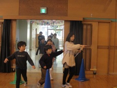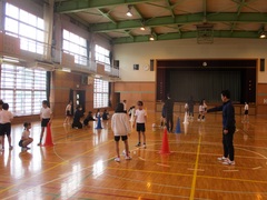 まずは、ブラインドサッカーの説明を受けてから、アイマスクをしている子と、していないガイド役に分かれて動きの練習をしました。その後、音の鳴るサッカーボールを使って、ガイドの指示に従い、ドルブルやシュートゲームを行い、楽しみながらもブラインドサッカーの難しさを体感しました。