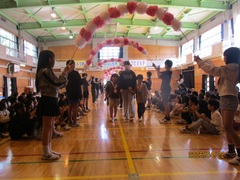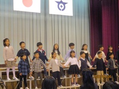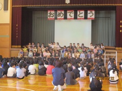 入場前に6年生から手作りメダルのプレゼントを首にかけてもらい、6年生と手をつないで入場した1年生は、ひな壇の上で全校児童と対面しました。緊張した面持ちで入場した1年生、全校児童が温かい目で見守っている様子が伝わったのか、すぐに嬉しそうな表情に変わりました。