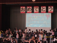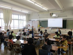 校長先生のお話、代表委員による児童代表の言葉の後、全校ゲームは萩中小が詳しく分かる「〇×ゲーム」が行われ、1年生も楽しそうに参加していました。